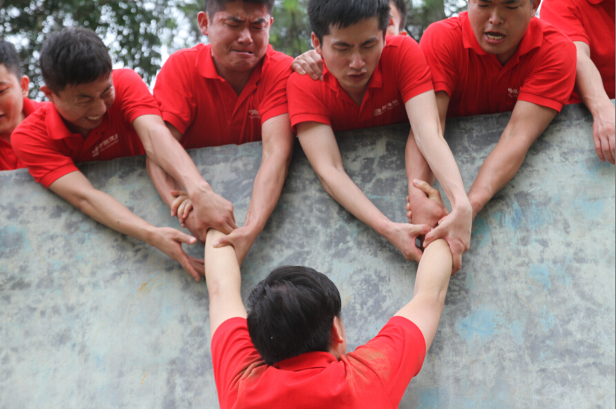 素质拓展训练中,队员奋力将队友拉上毕业墙。
